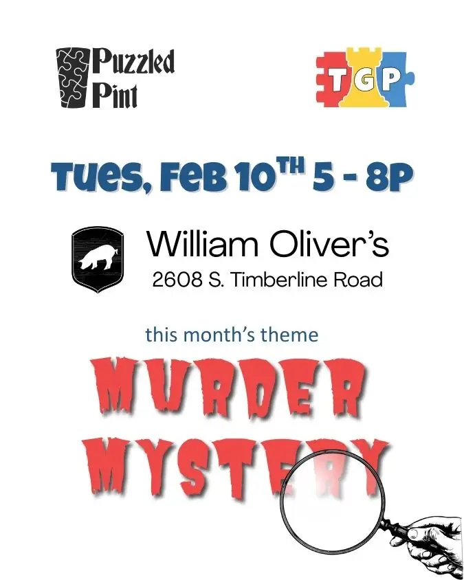 This month we will be at William Oliver’s at the corner of Timberline & Drake, and the Puzzled Pint theme is Murder Mystery!